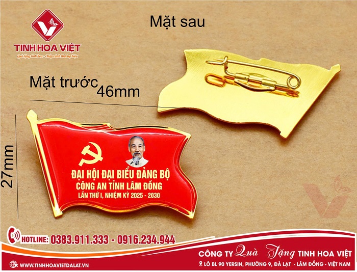 - Phân khúc cao cấp: Huy hiệu đồng đúc mạ vàng/mạ bạc, logo 3D cao cấp, hộp đựng sang trọng.