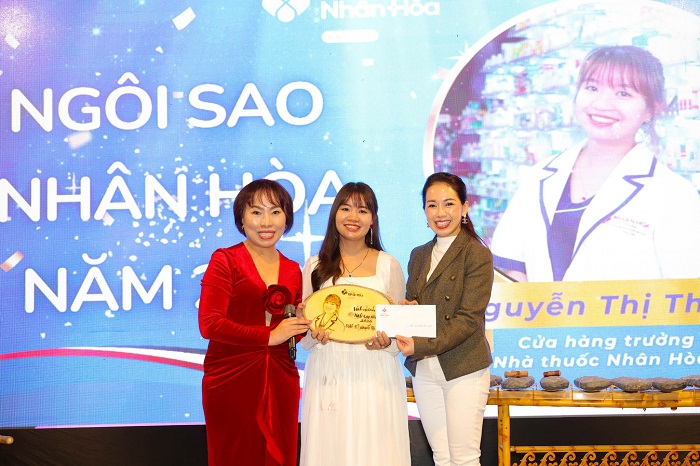 CEO Phạm Hà Thủy Anh - Hệ thống Nhà thuốc Nhân Hòa (bìa trái) khen thưởng, tuyên dương nhân viên xuất sắc