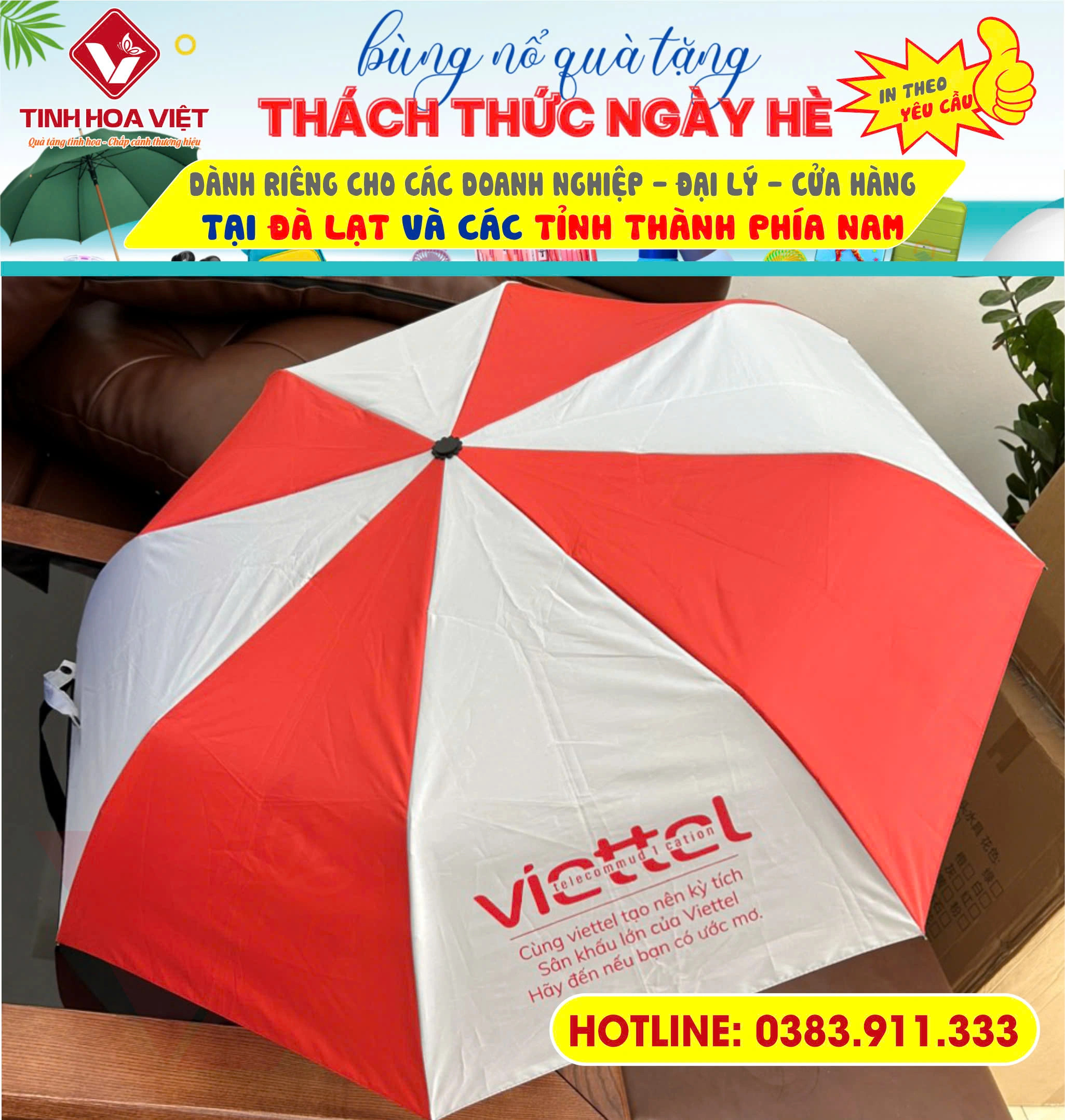Ô dù là vật dụng không thể thiếu trong mùa xuân hè, vừa che nắng vừa che mưa. Với thiết kế đẹp, mẫu mã và chất liệu đa dạng, màu sắc bắt mắt, chất lượng đảm bảo, bền bỉ theo thời gian. Bên cạnh đó, Tinh Hoa Việt còn cungc cấp dịch vụ in Logo thương hiệu Doanh nghiệp, đơn vị, cơ quan, tổ chức, sự kiện… để góp phần quảng bá, tạo sự lan tỏa.